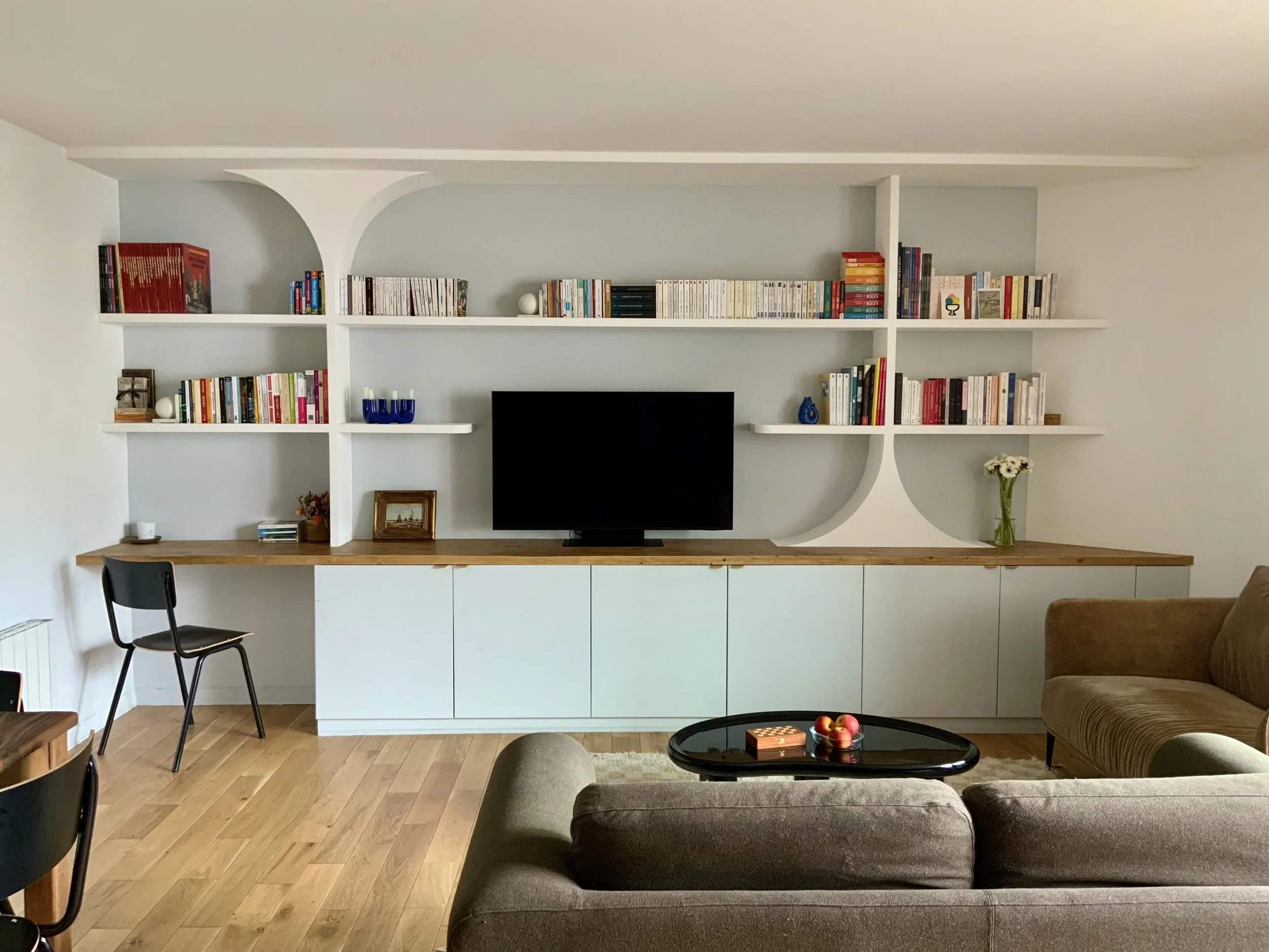 Une bibliothèque sur-mesure aux lignes arrondies intègre un bureau discret à gauche, avec des rangements fermés en bas et ouverts en haut.