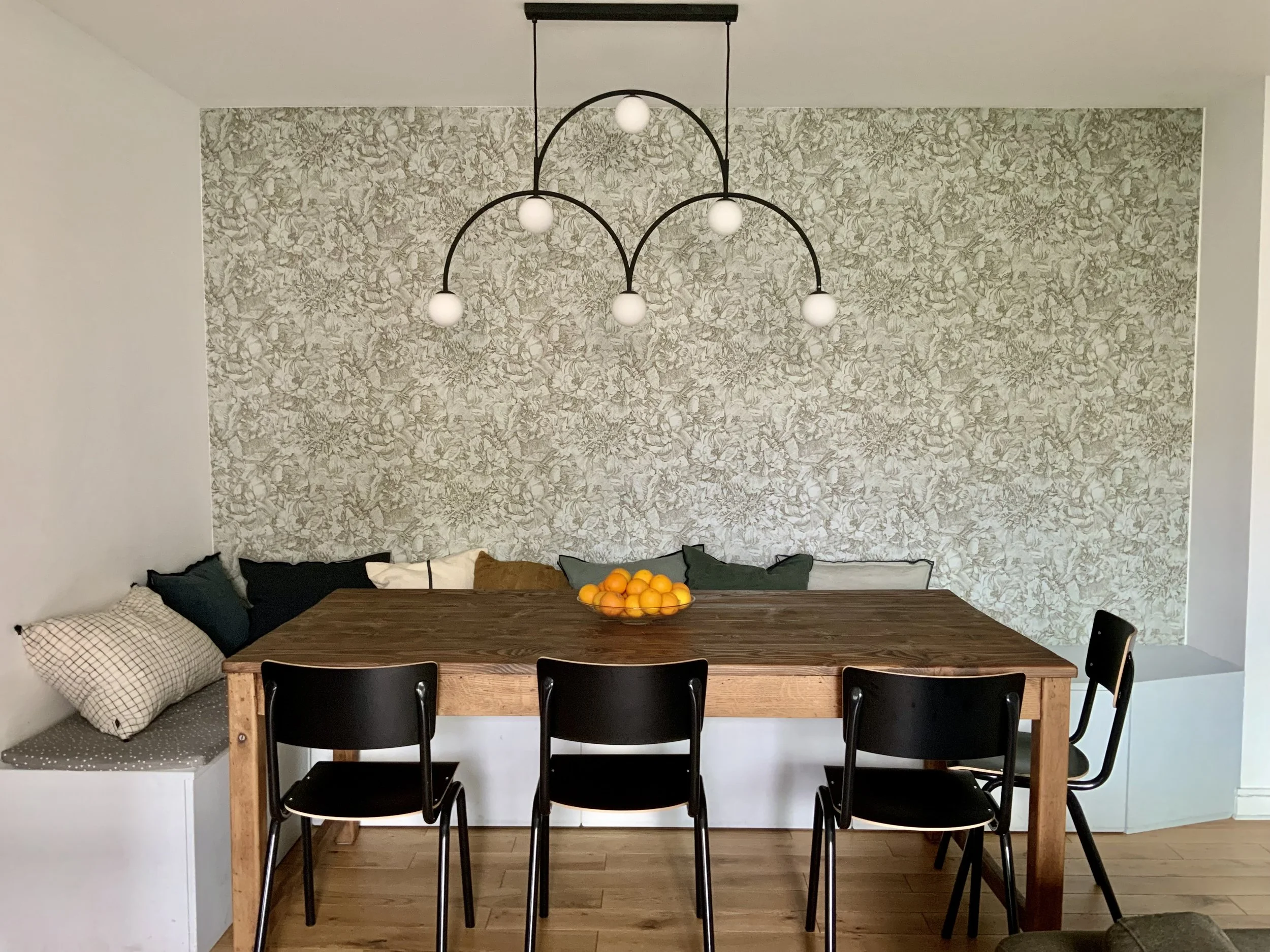 Un banc sur-mesure habille la salle à manger, accompagné d’un papier peint soigneusement choisi pour habiller le mur.