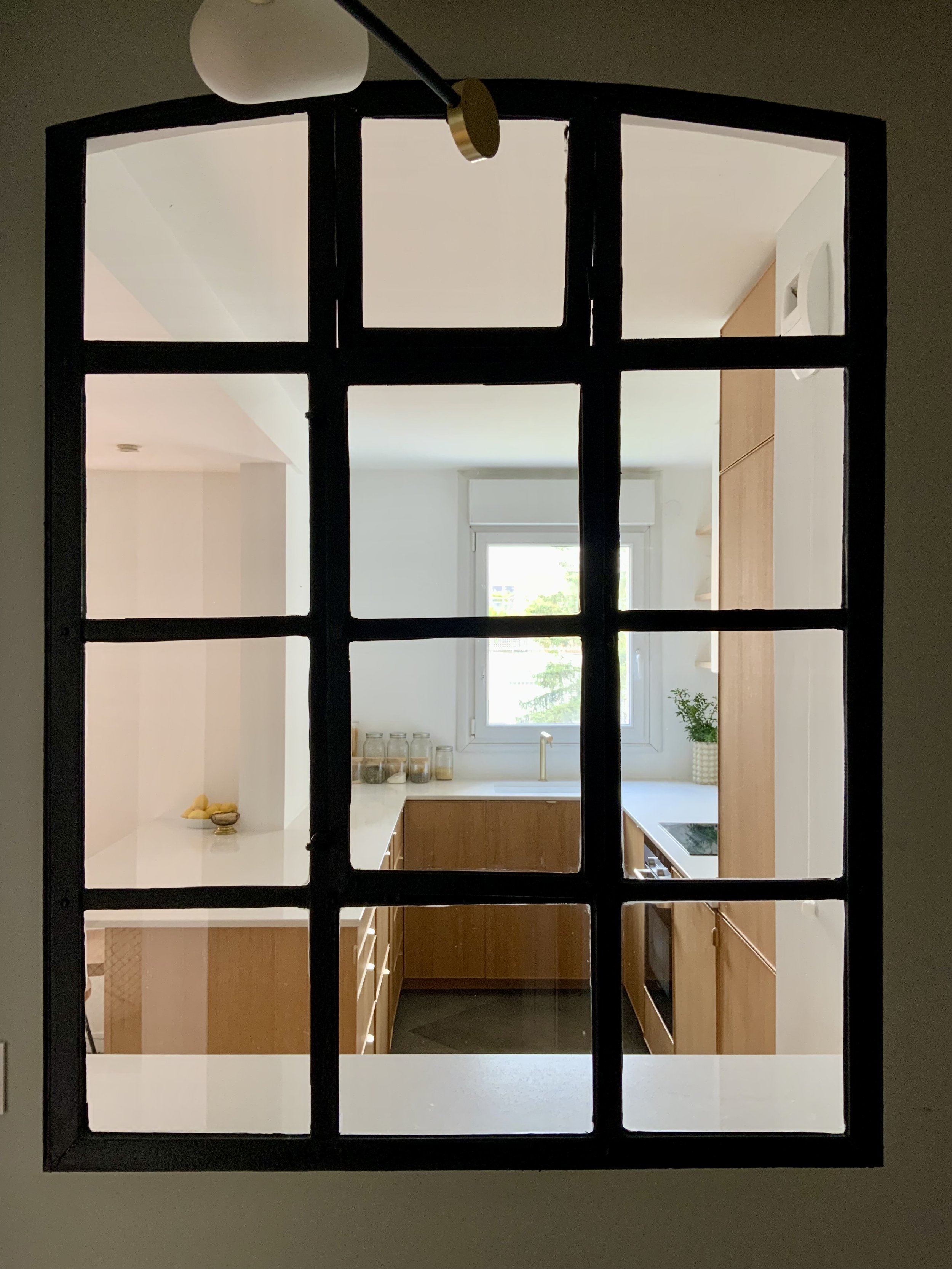 L’entrée a été ouverte sur la cuisine grâce à une verrière chinée, apportant une fluidité visuelle et une luminosité accrue.