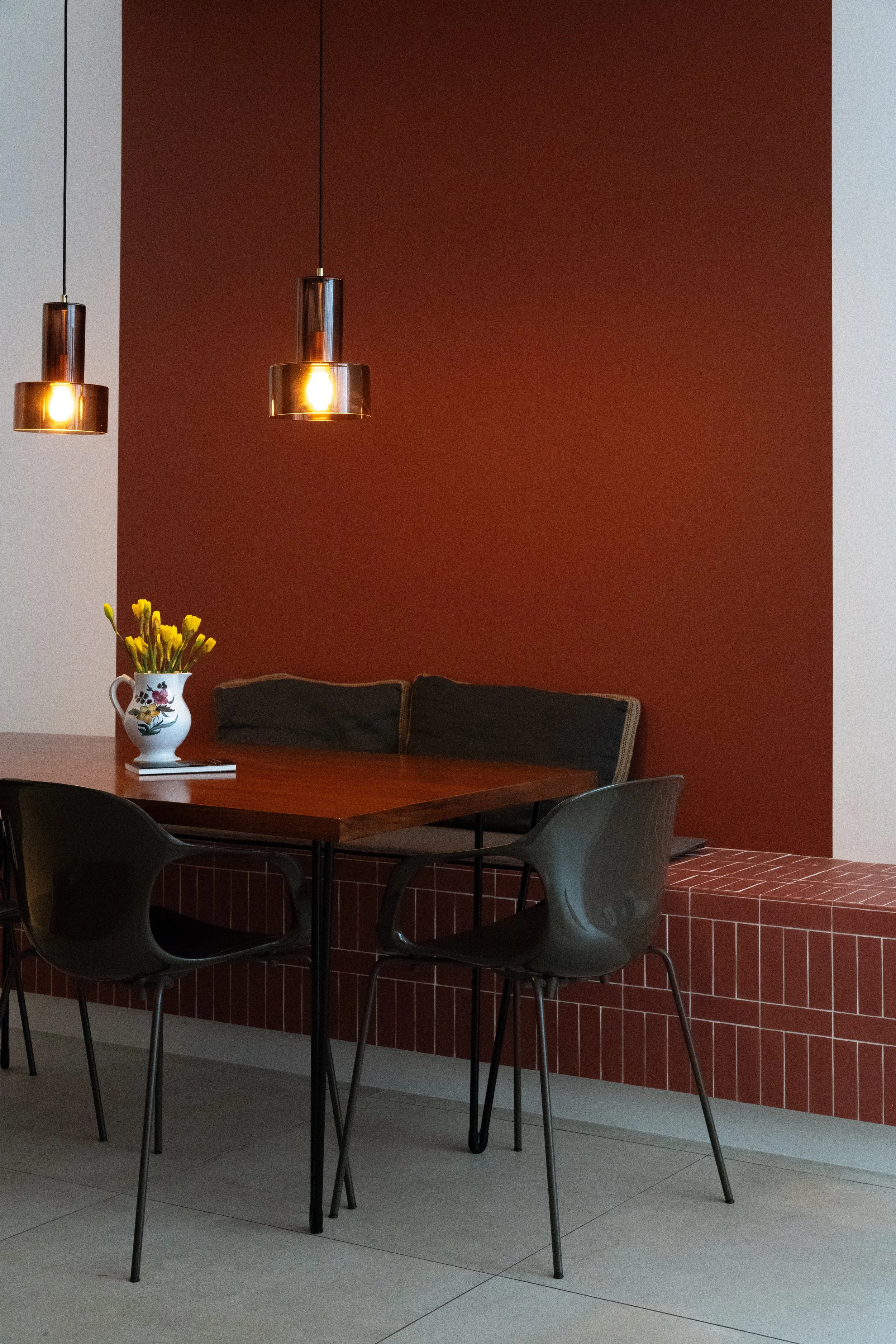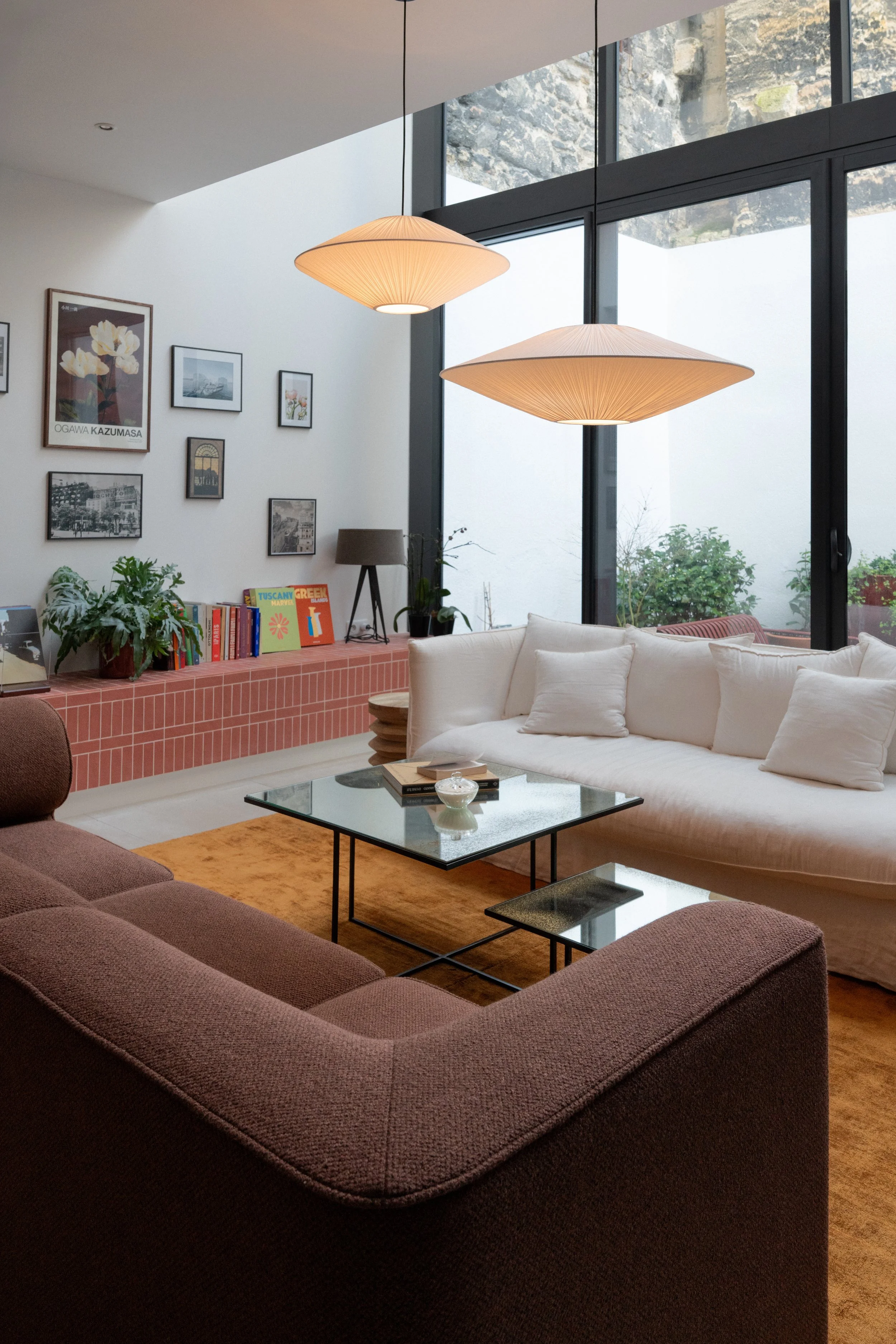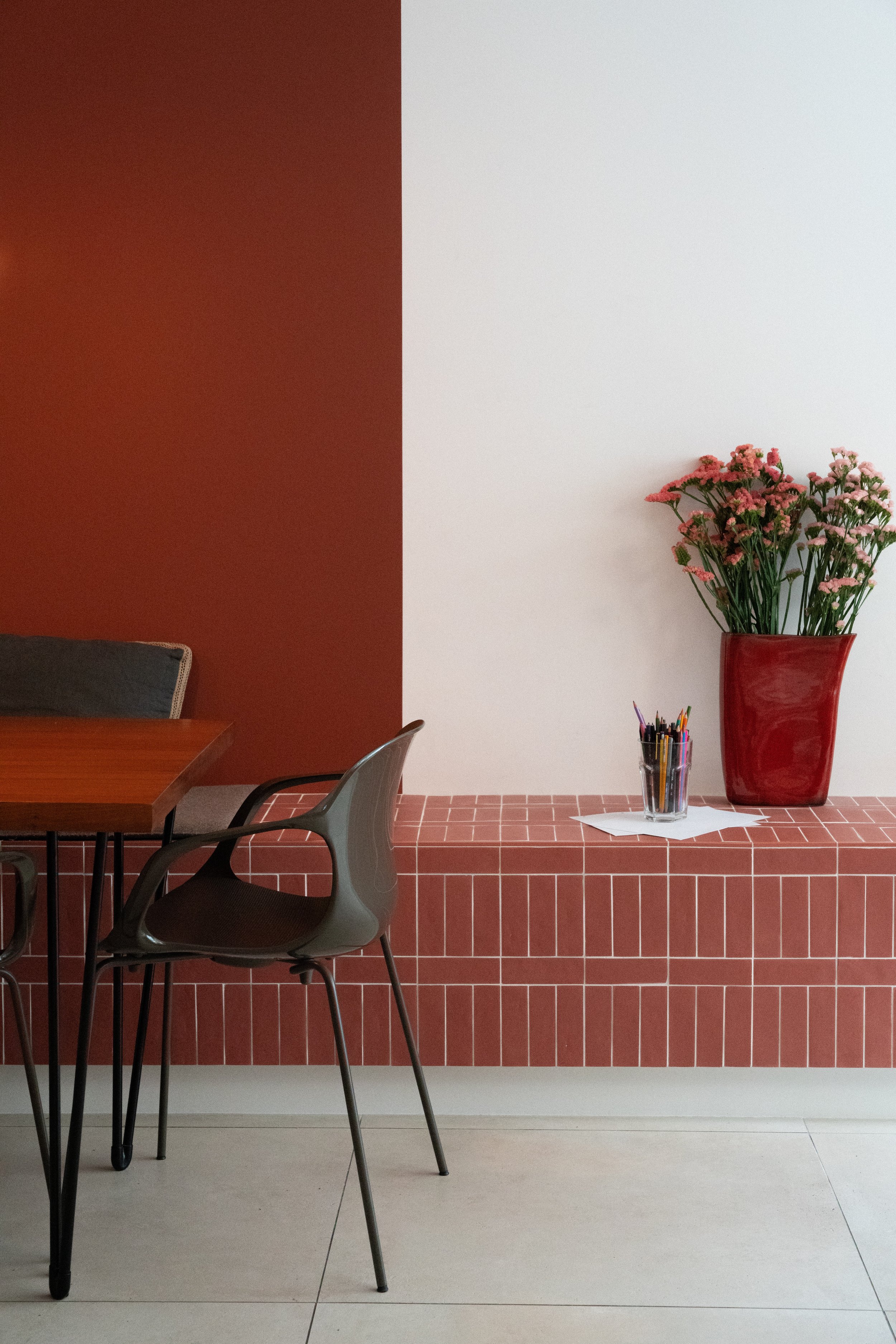Nous avons privilégié des travaux d’embellissement pour conserver les volumes existants. Le calepinage en carrelage (Casalux) du conduit de cheminée et de la banquette a permis d’apporter un effet brique contemporain, tout en renforçant la chaleur de l’espace. La peinture, associée à des objets décoratifs et des plantes, a finalisé cette ambiance chaleureuse et vivante.