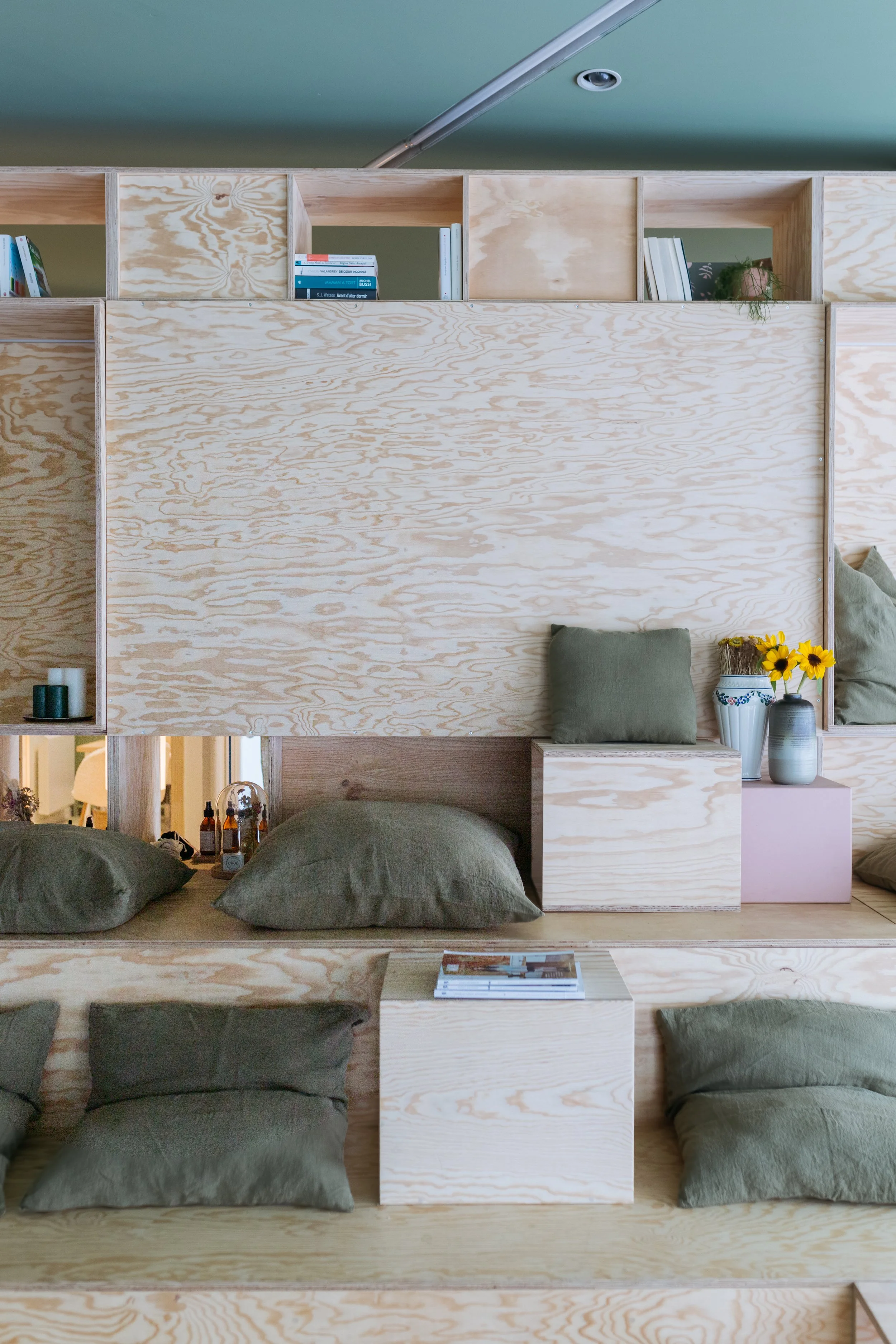 La cuisine entoure les poteaux en bois au coeur de la structure, les tisanes de la marque ressortent particulièrement sur la peinture sauge faite spécialement en accord avec la charte graphique de la marque.