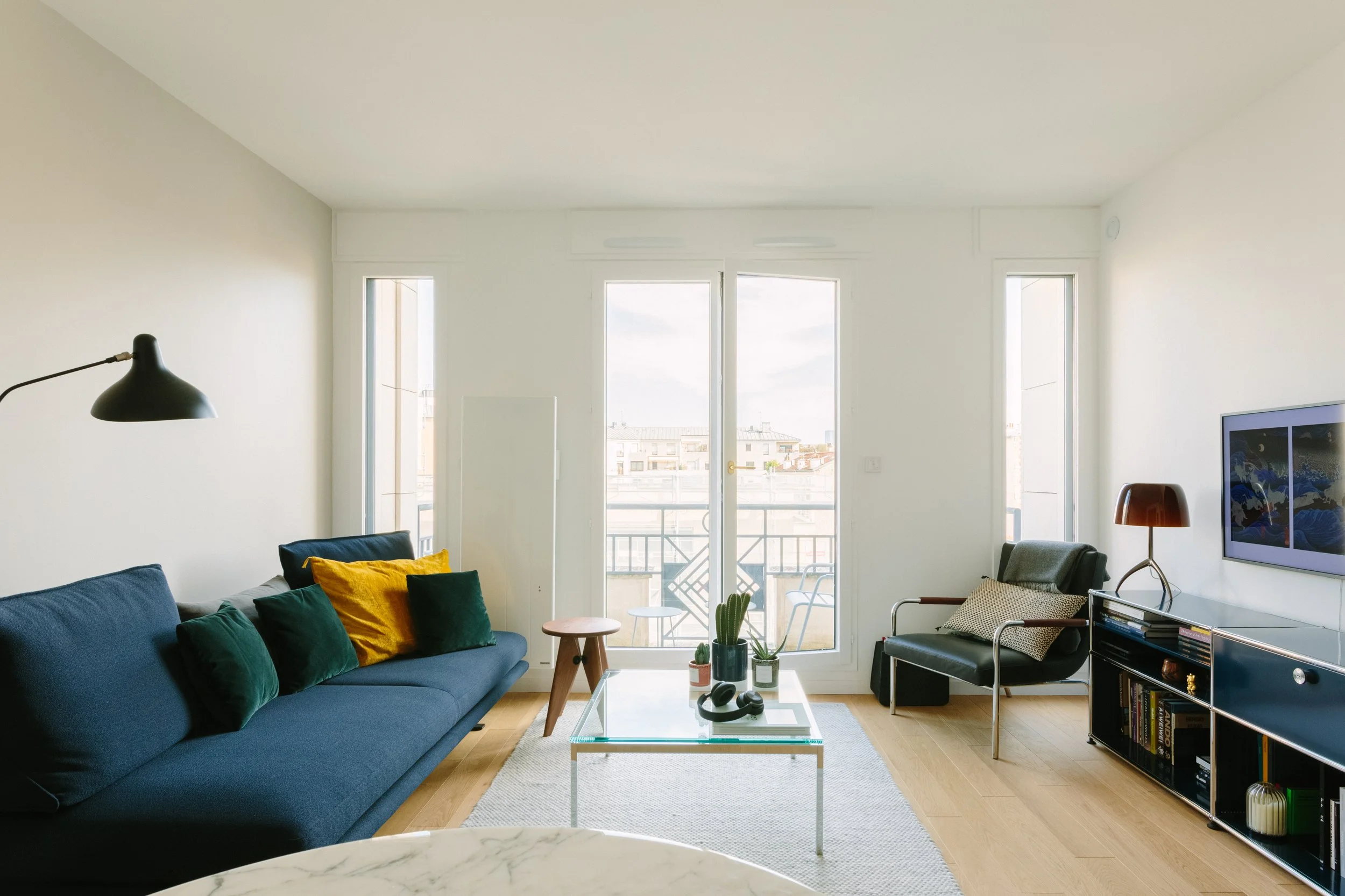 Nous souhaitions également intégrer complètement la troisième fenêtre à la pièce de vie. Nous avons donc sacrifié le dressing intégré de la chambre pour décaler la cloison et obtenir une plus grande ouverture dans la pièce de vie. La pièce gagne ainsi en géométrie et attire le regard vers la vue extérieure et le balcon attenant.
