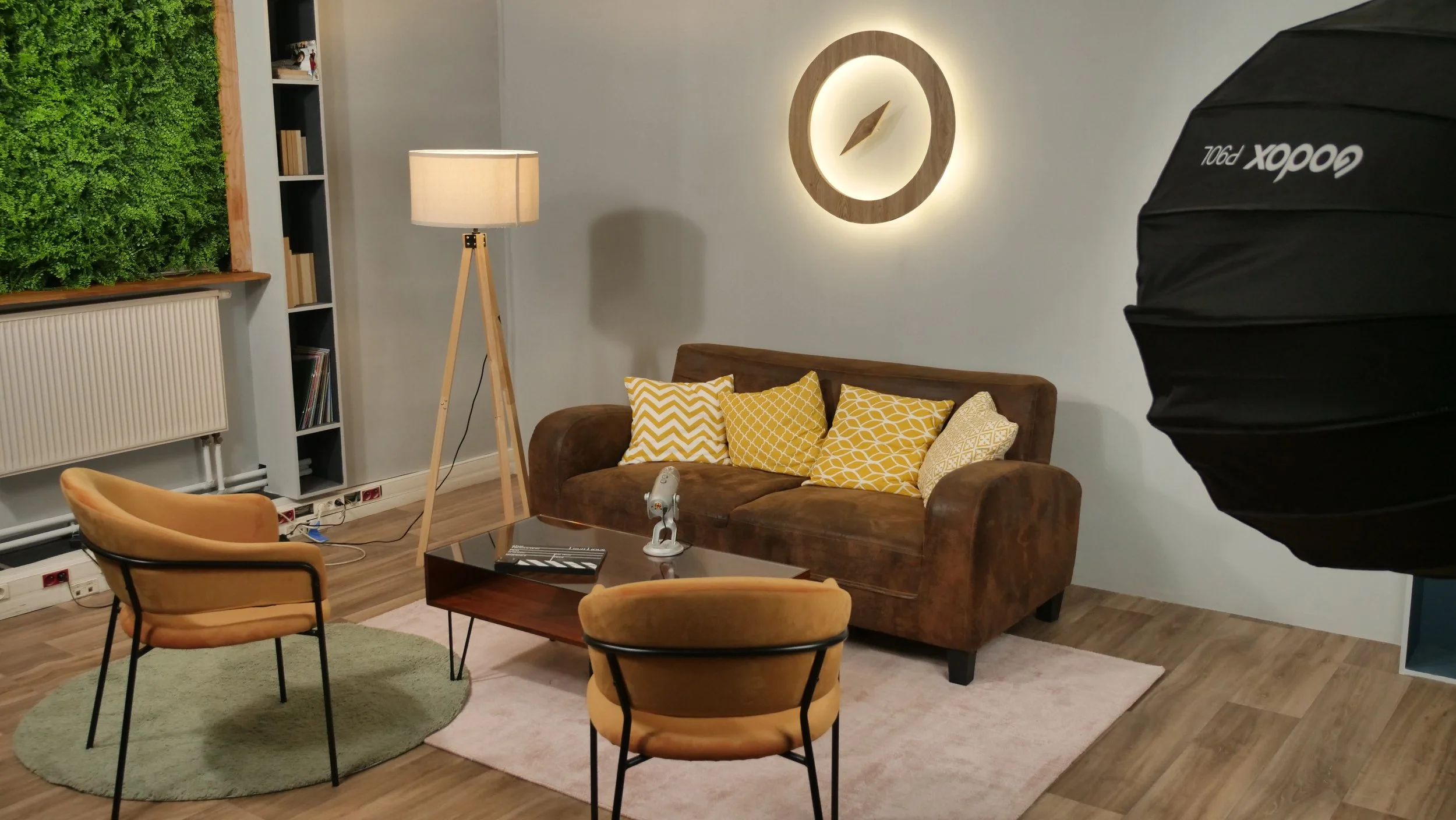 La boussole donne le cap et permet de reconnaître facilement qu'il s'agit d'une vidéo Livementor, les couleurs du set rappellent la charte graphique de la marque et l'idée générale était de donner une ambiance chaleureuse, comme à la maison.